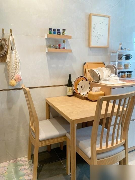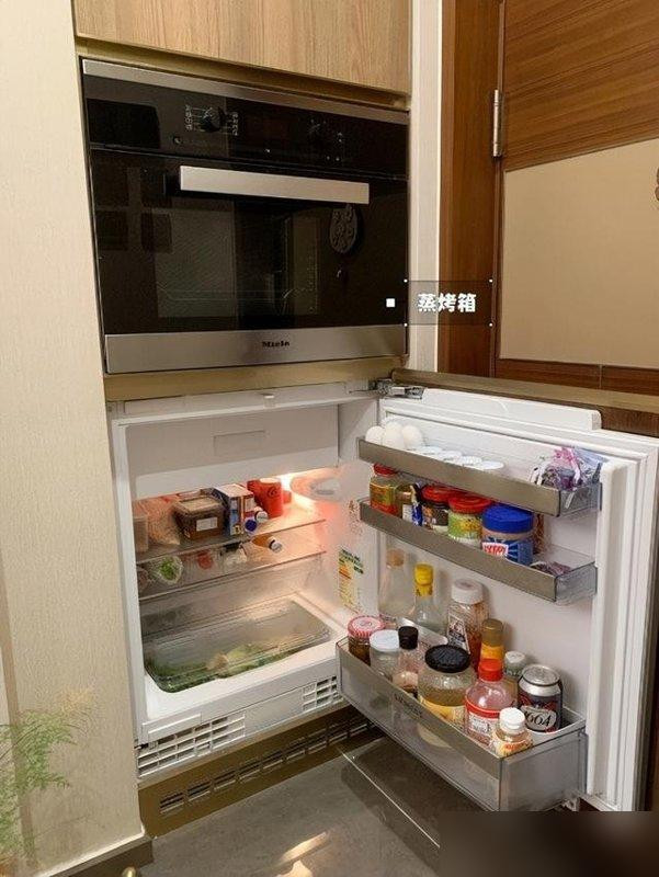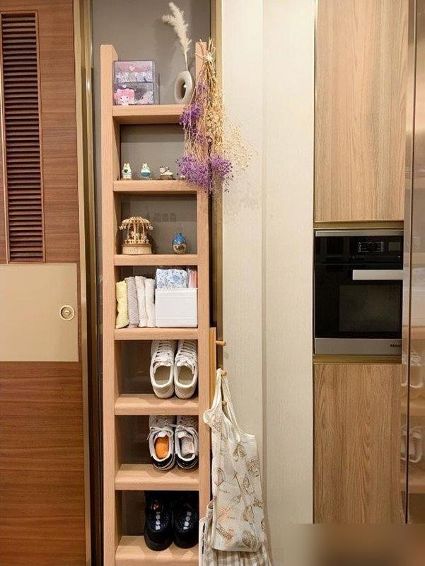 进门先被那组“吞万物”的鞋柜惊到:顶天立地不说,侧边还挖了个小壁龛,香薰、钥匙、口罩整整齐齐“站岗”,再也不用翻包翻到冒汗;冰箱直接蹲进柜肚里,底部百叶窗解决散热,噪音小到连猫打呼噜都盖得住;微波炉挂在半空,热个牛奶不用弯腰,小孕妇都能优雅冲夜宵——这哪是装房子,分明是把每一寸空间都“抠”到了毫米里!